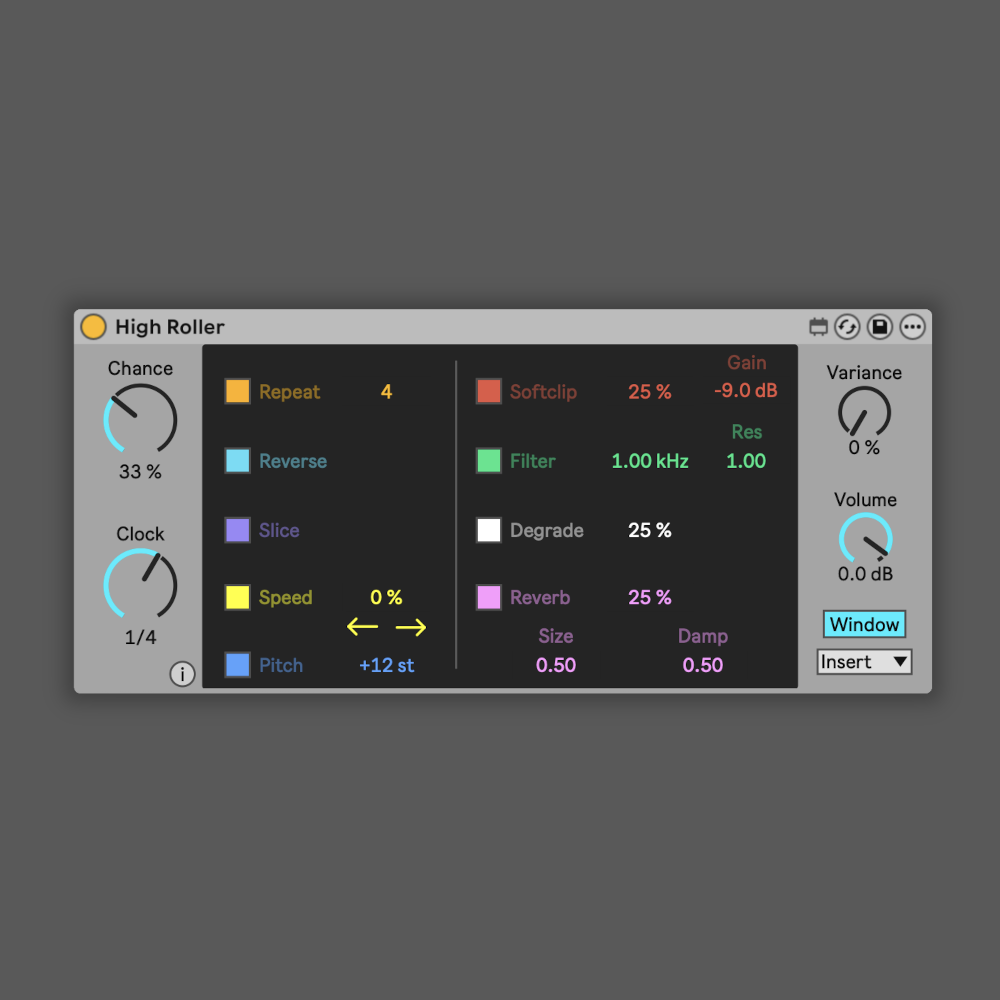 High Roller is a chance-based multi-FX Max for Live audio device designed to bring subtle variation or chaotic mangling to your tracks.